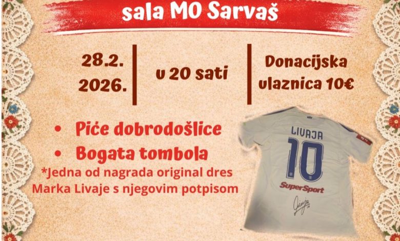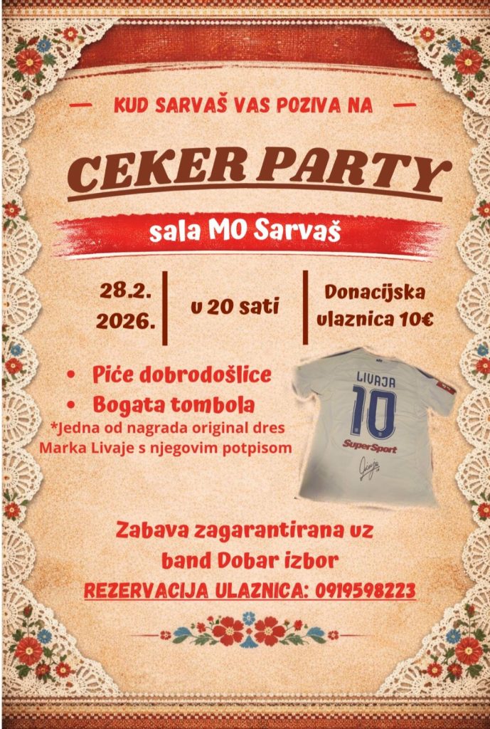KUD Sarvaš poziva sve mještane Sarvaša i okolice na veselu i opuštenu večer ispunjenu glazbom, druženjem i bogatom tombolom – Ceker party, koji će se održati 28. veljače 2026. godine u sali MO Sarvaš, s početkom u 20 sati.