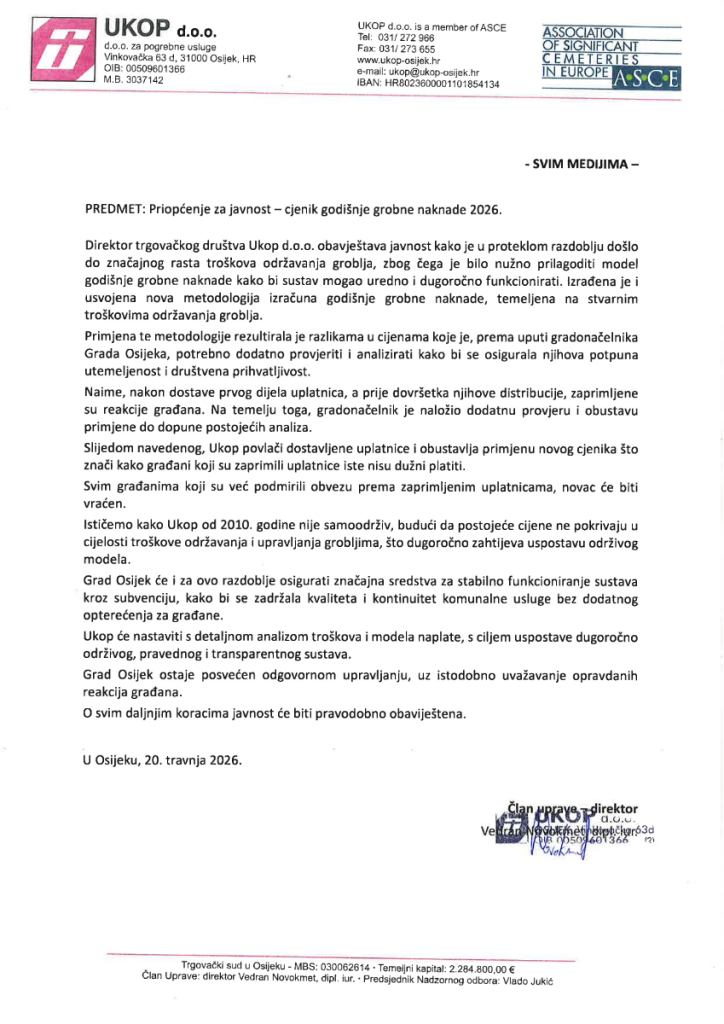 Tvrtka Ukop d.o.o. obustavila je primjenu novog cjenika godišnje grobne naknade za 2026. godinu nakon reakcija građana i zahtjeva Grada Osijeka za dodatnom analizom.